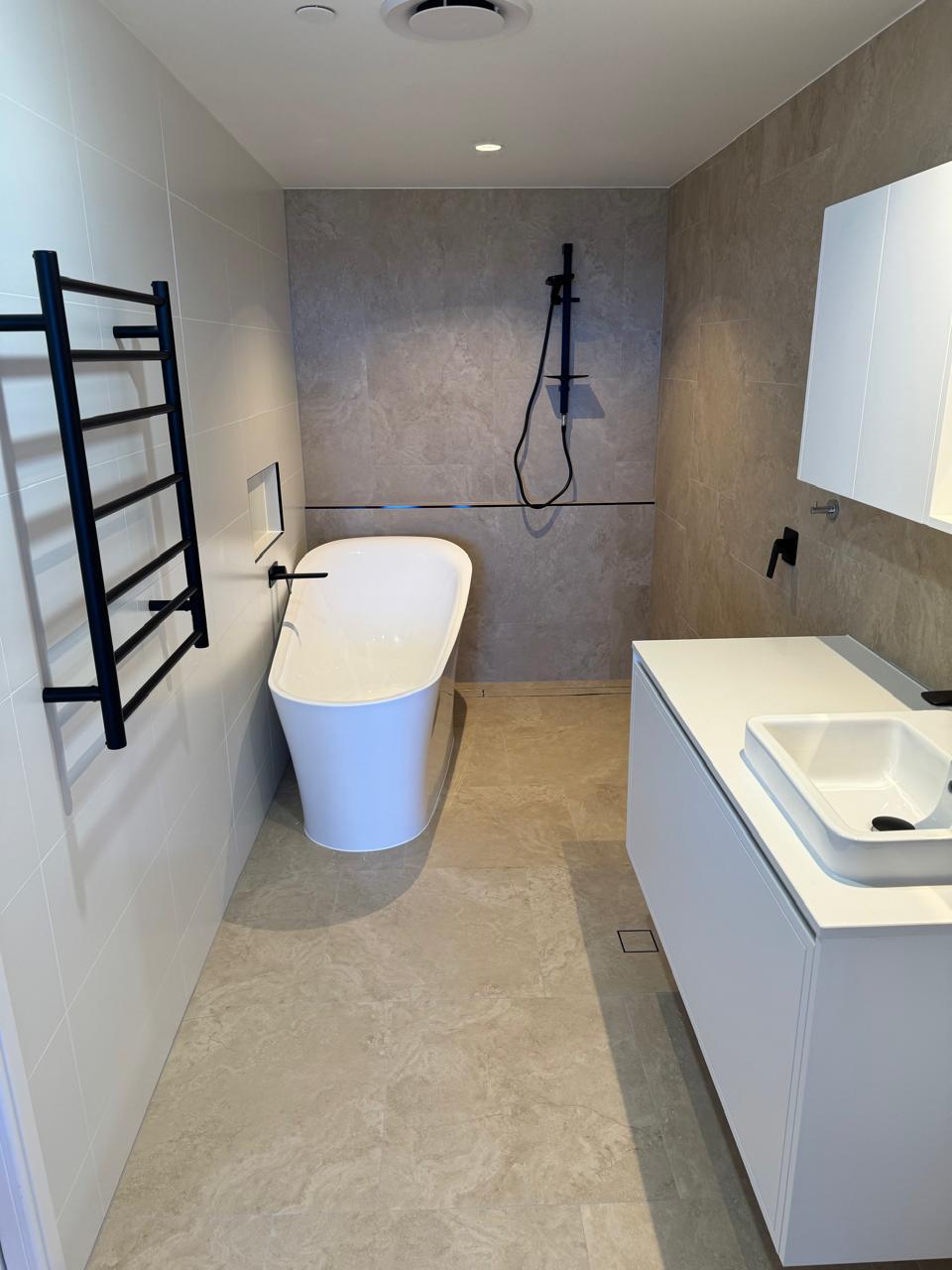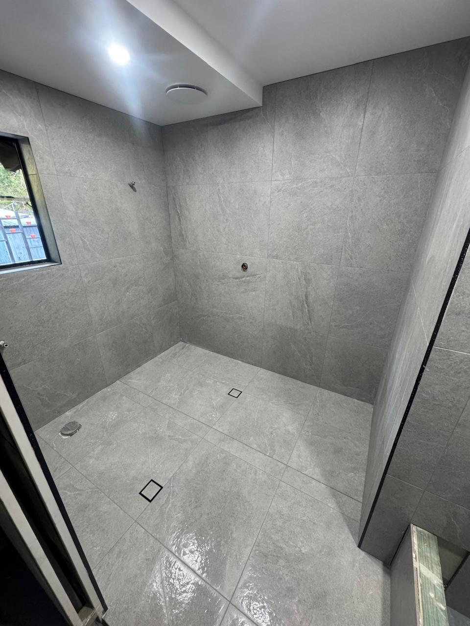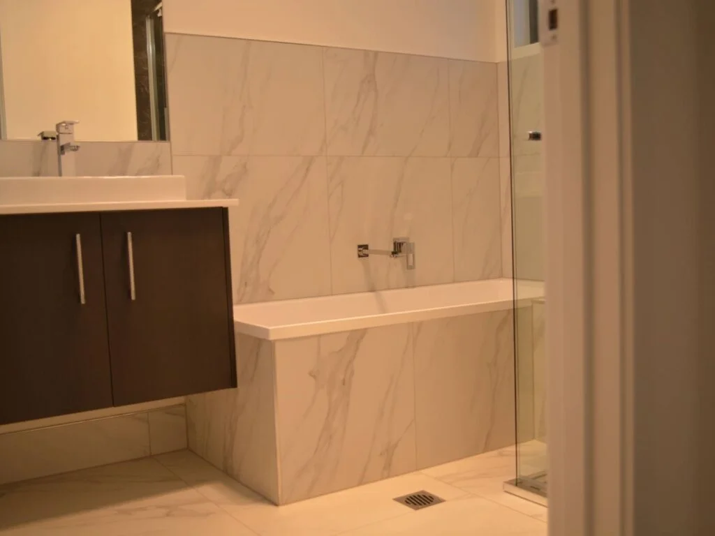 Expertly installed large-format tiles with flawless alignment, creating a sleek and contemporary bathroom finish